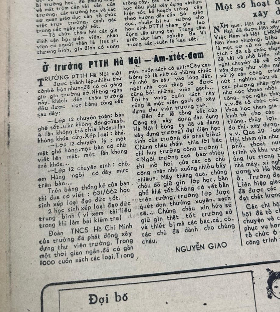Bài trên báo Hà Nội Mới ngày 30/1/1986. Tác giả Nguyễn Giao có lẽ là thầy Hiệu phó phụ trách xây dựng của trường khi đó: